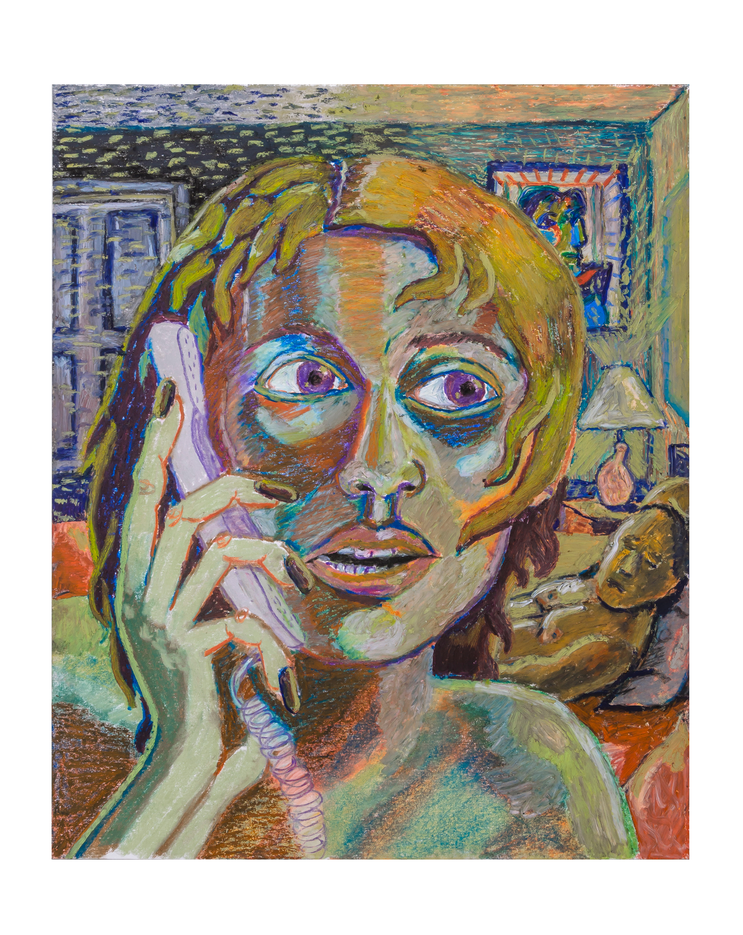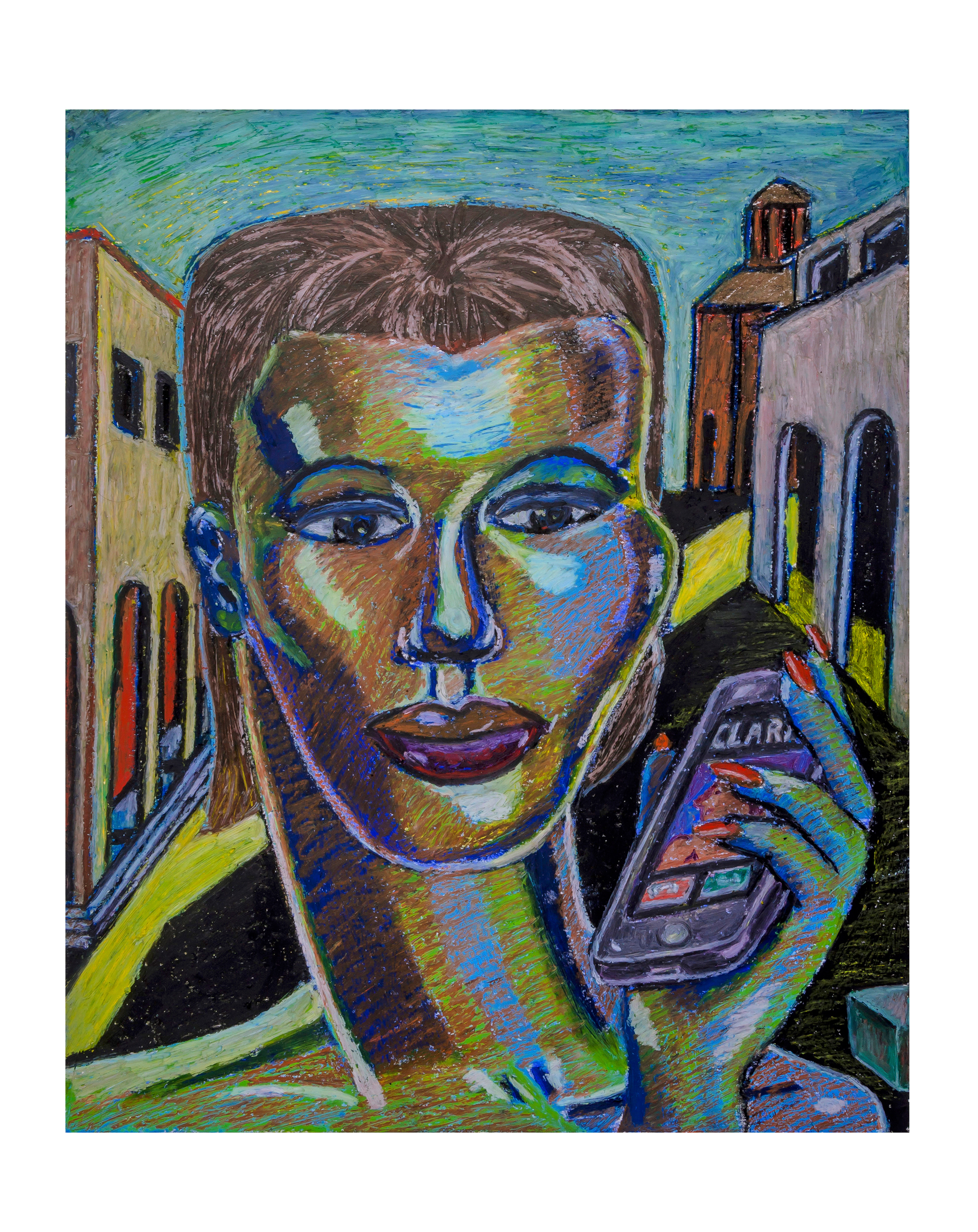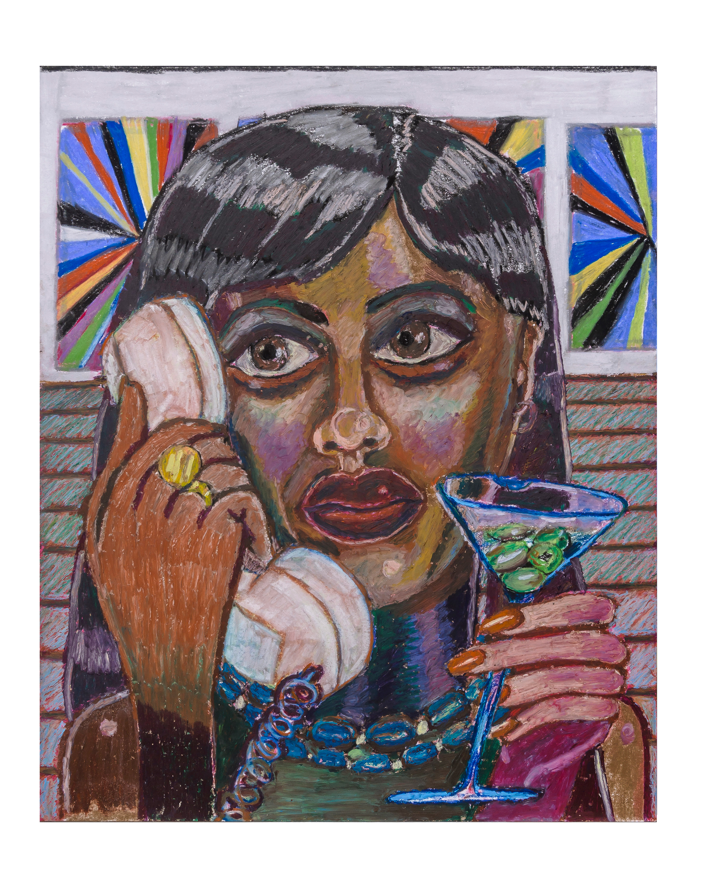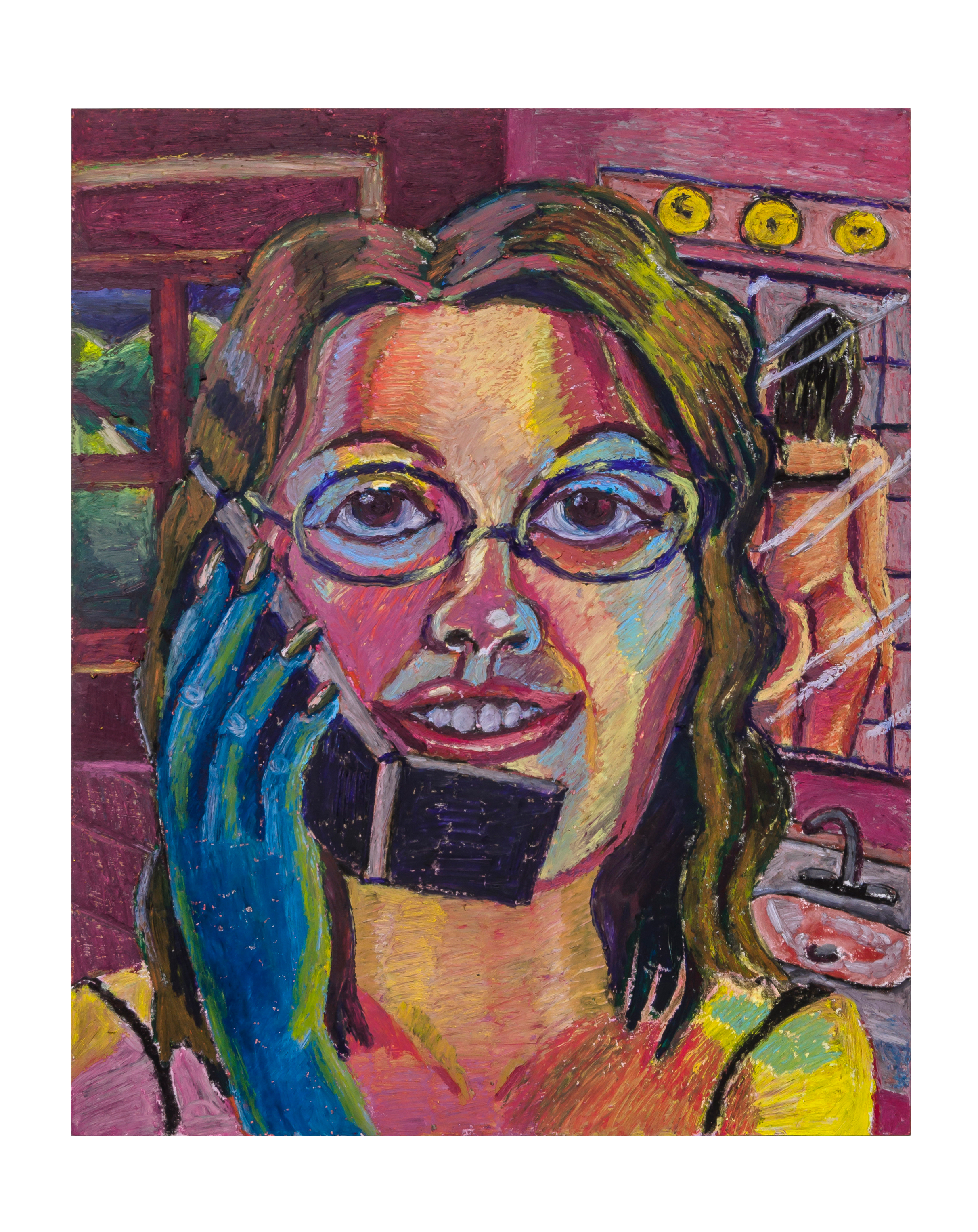 Kim Texting in the Club // Oil pastel on paper // 11 x 17 inches // $950.00 Steph Says "Totally" // Oil pastel on paper  //  11 x 17 inches  //  $950.00 `Miranda Says "Mhmm" // Oil pastel on paper // 11 x 17 inches // $950.00